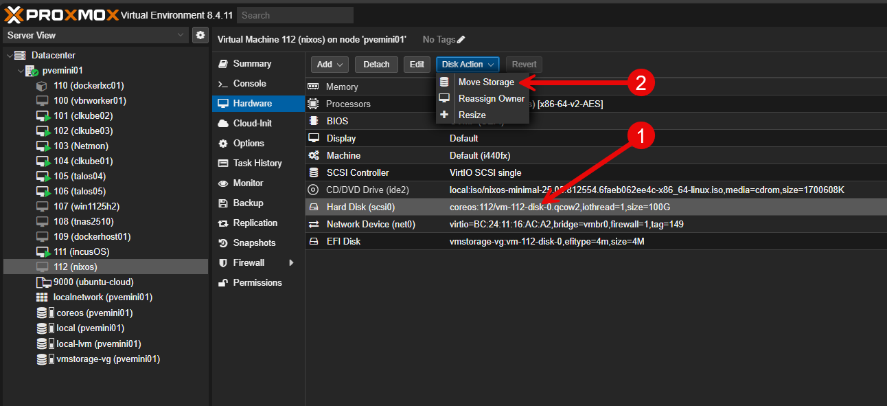 Ok so I just had to do this on a few virtual machines in my home lab and wanted to throw out a few screenshots of the process. You can move Proxmox virtual machine storage while a VM is powered on or off. Here are the screenshots to follow. First you click the virtual machine for which storage you want to move. Then you click the Hard Disk you want to move. Then under Disk Action, you will select Move Storage.