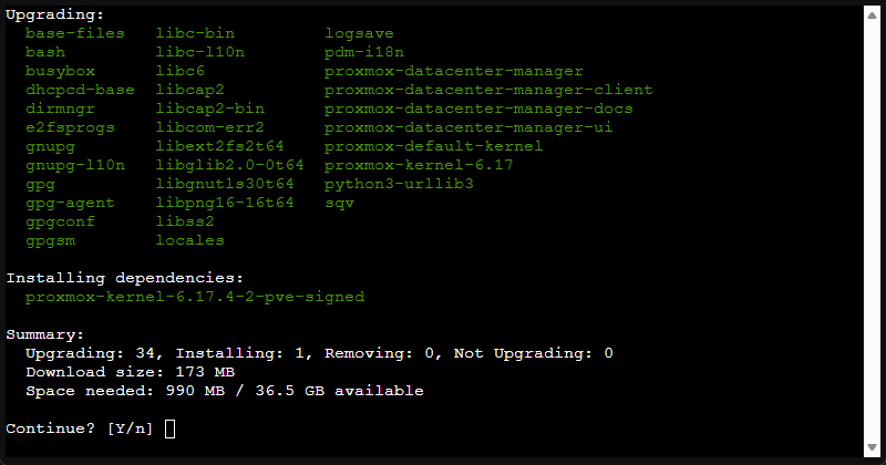 Then refresh the updates that are available. Once you have done that, you can apply the updates. It will launch the pop-up dialog like it does with Proxmox VE Server and you will type a Y to confirm.