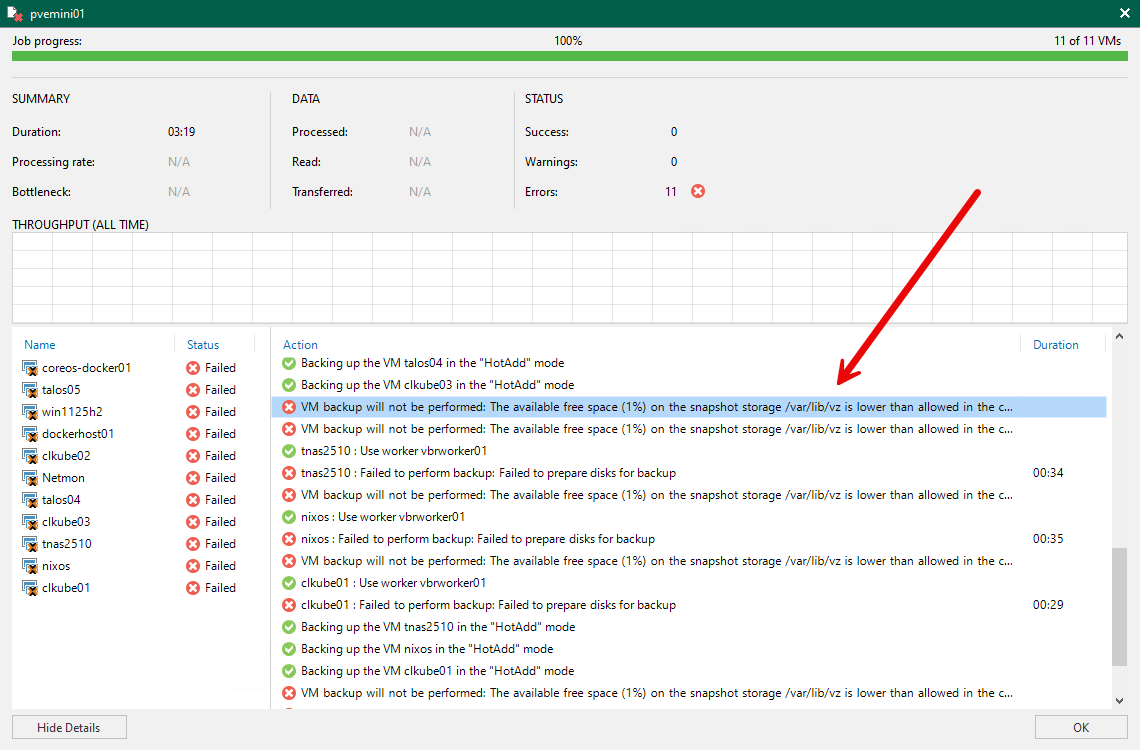 Just a quick note if you are using Veeam to backup your Proxmox VE Server environment, you may run into an issue where your backups may start failing if you run out of space on the snapshot storage. This is the storage you configure when setting up your Proxmox VE Server backup job in the Veeam VBR Console. Here is what the error looks like: