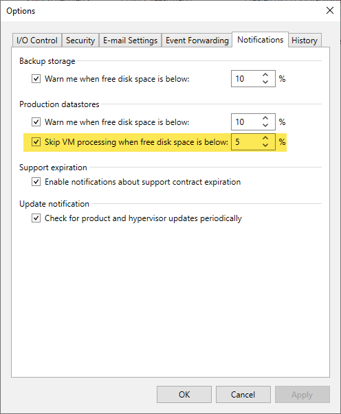 In my home lab environment, this was the result of me going in and playing around creating VMs and not paying attention to where a couple of template disks were created. The default space before backups fail with this error is 5% which is configurable for your snapshot storage. If you want to take a look at these thresholds or make changes, you can navigate in the menu to Options > Notifications. Here you will see the item Skip VM processing when free disk space is below...